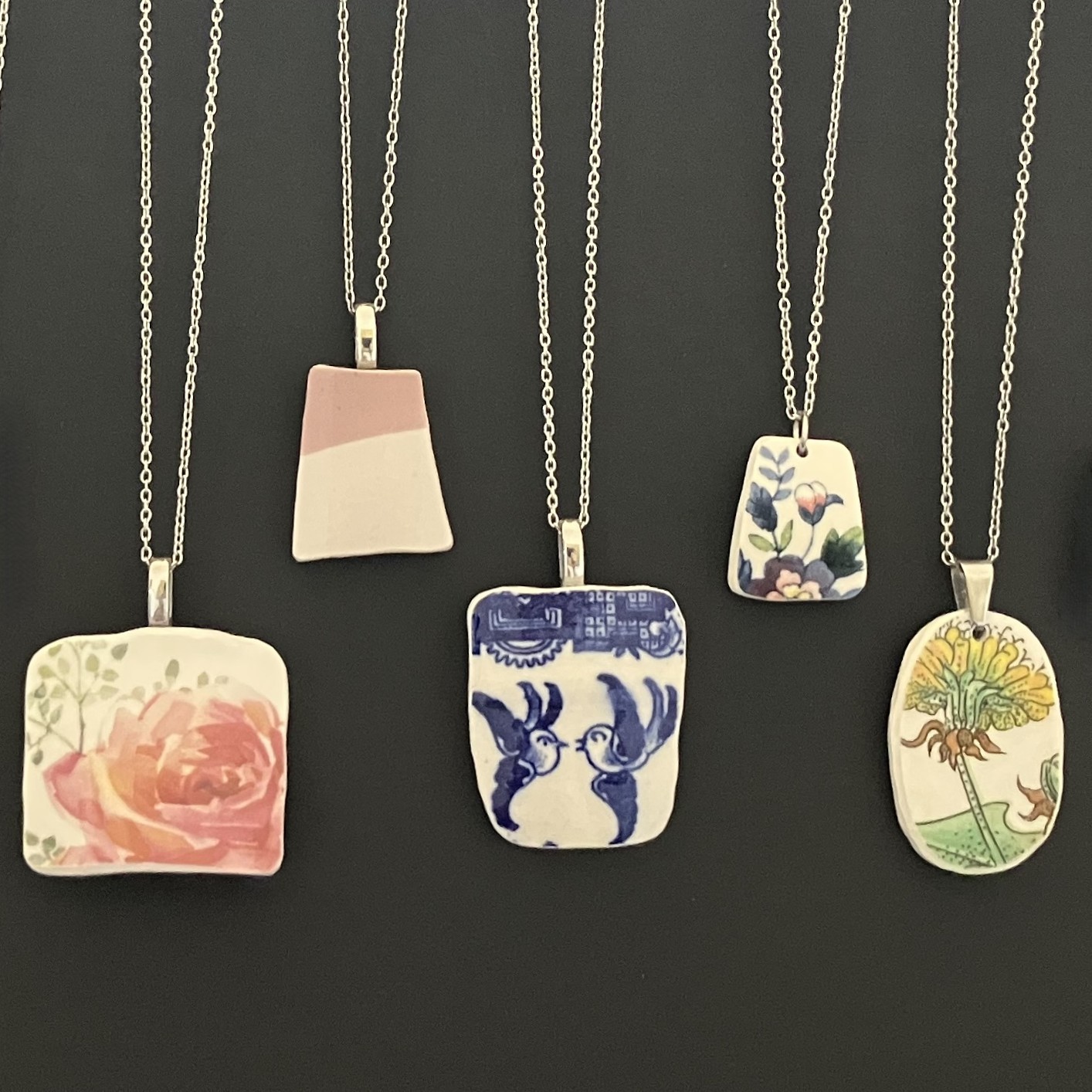 Porcelain and ceramic dishes crafted into eye-catching pendants.